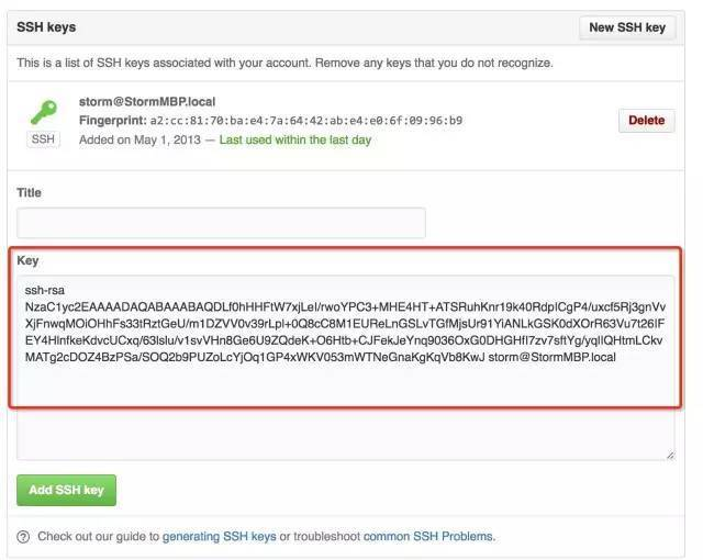需要做的只是在 Key 那栏把 id_rsa.pub 公钥文件里的内容复制粘贴进去就可以了(上述示例为了安全粘贴的公钥是无效的),Title 那栏不需要填写,点击 **Add SSH key **按钮就ok了。