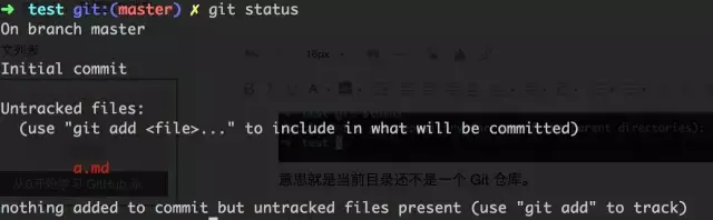 默认就直接在 master 分支,关于分支的概念后面会提,这时最主要的是提示 a.md 文件 Untracked files ,就是说 a.md 这个文件还没有被跟踪,还没有提交在 git 仓库里呢,而且提示你可以使用 git add 去操作你想要提交的文件。