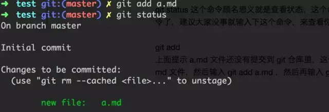 - git add 上面提示 a.md 文件还没有提交到 git 仓库里,这个时候我们可以随便编辑下 a.md 文件,然后输入 git add a.md ,然后再输入 git status :
