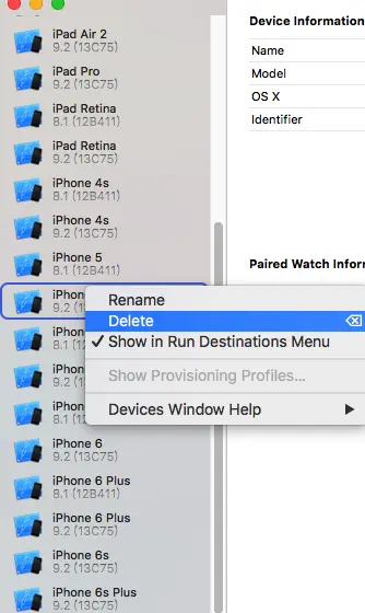 Xcode模拟器不显示SDK版本,反而显示设备ID的解决办法 ocarol 2017-12-13 330 阅读1分钟 今天在应用程序中修改了Xcode app 的名称,结果导致Xcode模拟器不显示SDK版本,反而显示设备ID了,感觉特别的忧伤......如图: 进到Xcode->window->Devices发现有很多重复的模拟器,如图: 如何解决呢?方法很简单:删除掉重复的模拟器即可!!!! 不知道怎么删除的同学请看: 删除之后就好了!如图: