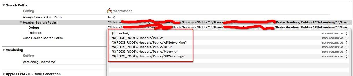 说明头文件的路径还是有问题的,我以前集成pod的时候,并没有特意去设置这个头文件路径,不清楚为什么朋友的会出问题,但是看来只能添加一个可靠的路径了,解决办法如下: