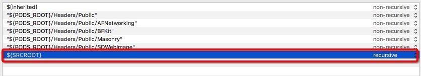 在路径中添加一个路径${SRCROOT},右边选择recursive,如图: