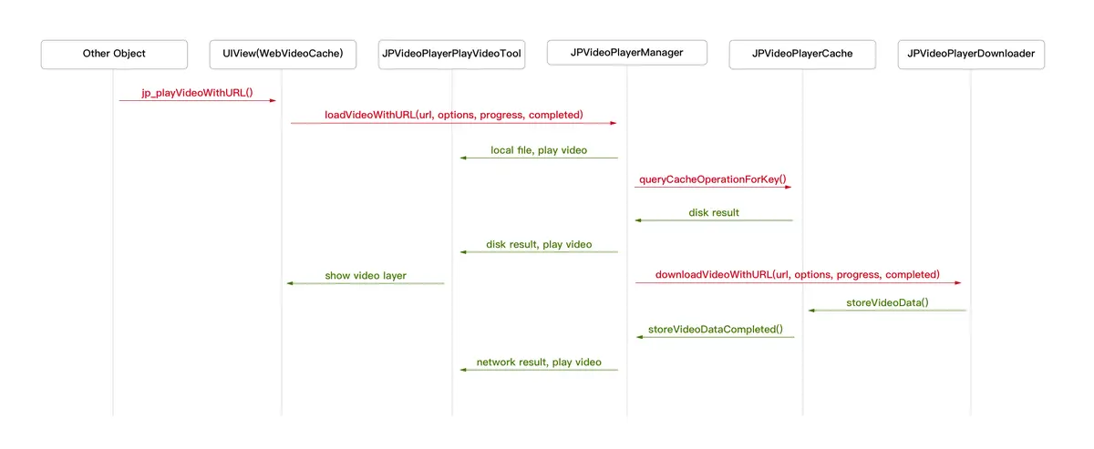 JPVideoPlayerDownloader下载工具类,这个工具类就会去网络上下载视频数据,每下载完一段数据,都会返回给JPVideoPlayerManager,JPVideoPlayerManager会先把这段数据给JPVideoPlayerCache,JPVideoPlayerCache先把数据缓存到磁盘,然后再把缓存的路径返还给JPVideoPlayerManager,JPVideoPlayerManager会把路径给负责视频播放的工具类JPVideoPlayerPlayVideoTool进行视频播放。