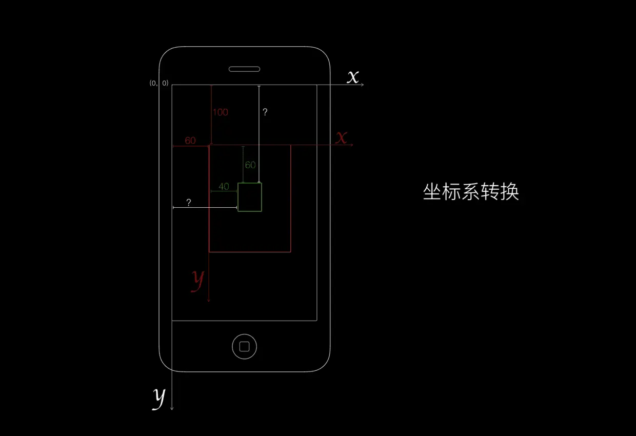 理清楚这些坐标转换是很有必要的,因为等会当视图关系变得很复杂的时候,假如不能理清楚,可能你自己都不知道在哪个坐标系,你会觉得明明自己写对了,但是代码跑起来就是错的。如果出现这种情况,还是应该回到起点来,理清楚这些坐标关系。
