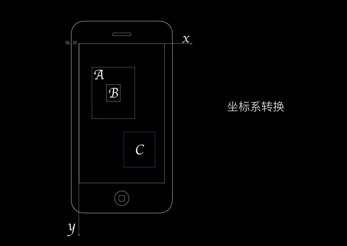 - 第一个函数,将一个当前 View 坐标系的 frame 转换为另一个 View 的坐标系上。比如说下图 A 中有个 B,如果要将 B 的 frame 迁移到 C 中,就应该这么写: