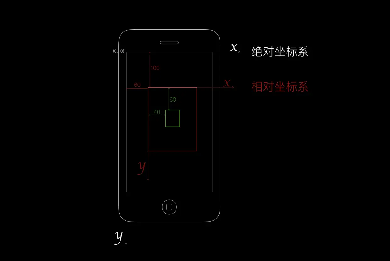 - 在我们的 iPhone 屏幕上有一个红色的矩形,它处在(60,100)的位置上(相对于绝对坐标系),它自身也有一个坐标系,让它体内的元素相对它进行定位,它的坐标系叫做相对坐标系(相对于绝对坐标系的坐标系)。