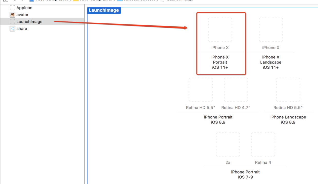 这里还有一个细节,拿到这张 iPhone X 启动图以后在你的项目里找到 Assets.xcassets 里的 LaunchImage,但是并没有放 iPhone X 启动图的位置,此时,你应该先把之前的启动图复制一份,然后将旧的 LaunchImage 删除,然后右键重新建立一个 LaunchImage,此时,你就可以看到 iPhone X 启动图的位置了。