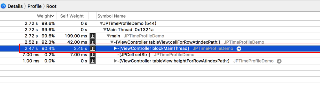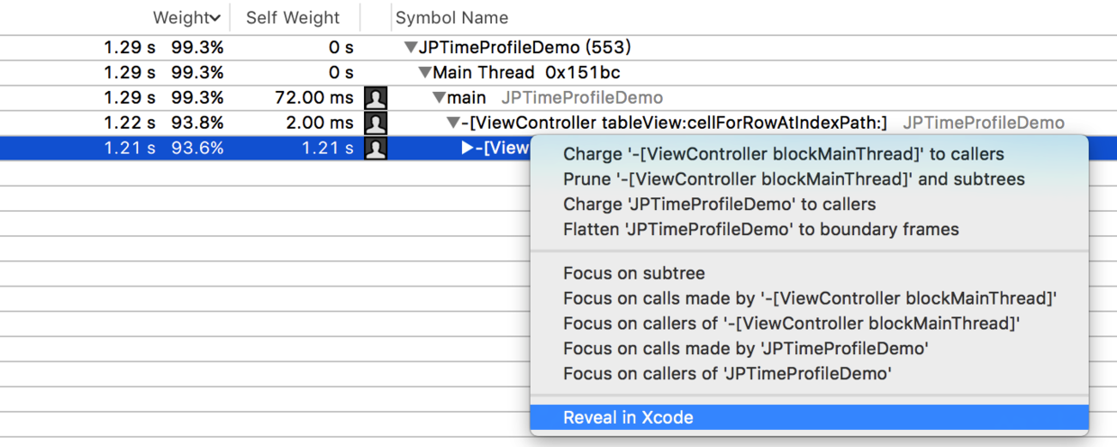 在 tableView 中滑动 cell 时,每循环一个 cell 就会调用这个 blockMainThread 方法,这样会导致主线程被阻塞,以至于界面出现卡顿。而这一切都反应到了 TimeProfiler 的监听结果里,通过层级关系,我们能看到 blockMainThread 方法占用了90.4%的时间,而且我们还可以右键这个方法,就会出现Reveal in Xcode,点击就能直接跳转到 Xcode 中对应的方法里了,非常方便。