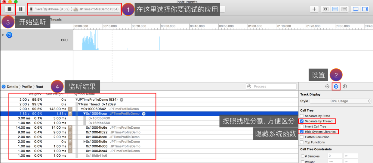 经过上面的配置,我们再重新运行项目,然后按照上面的方式配置TimeProfiler,你就能看到下面的结果: