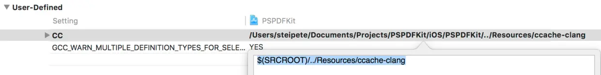 您还需要在 Xcode 中定义 CC 变量。在 PSPDFKit 中,我们在 .xcconfig 文件中执行此操作,这个文件在我们所有项目中共享(这是一个很好的统一的项目配置,和易于阅读和查找)。同时,您可以直接在 Xcode 项目设置内配置: