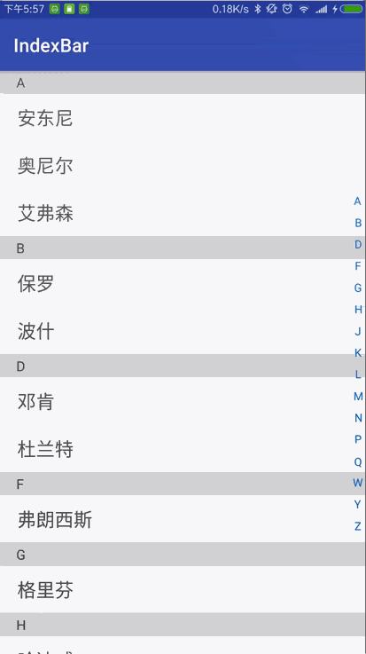 - 监听列表的滑动,当列表可见第一项发生变化时,更新悬浮 view 显示的字母为当前可见第一项的索引字母。