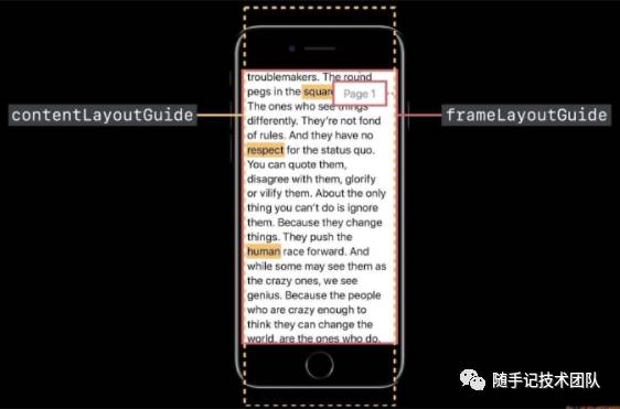 此外,为了便于开发者在 scroll view 中使用 Auto Layout. UIKit 还提供了两个新的属性。一个是 contentLayoutGuide, 它用来获取当前在 scroll view 内的内容的 layout guides. 而另一个是 frameLayoutGuide, 他用来获取实际内容的 layout guides. 这样说有点繁琐,还是看 WWDC 的原图吧: