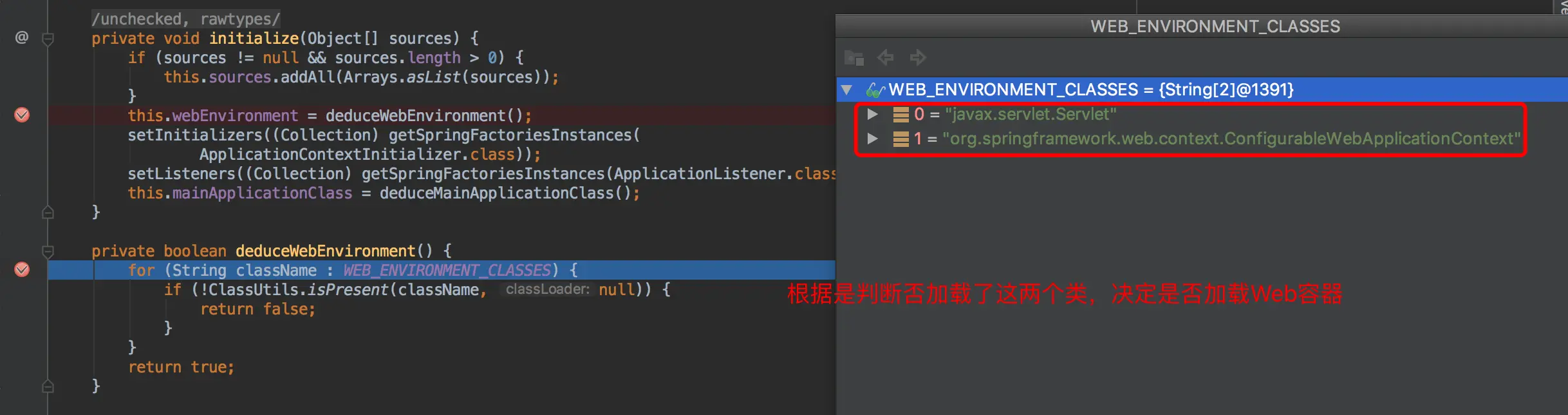 Application.class代码,我们会执行了两个方法:一个是initialize()初始化启动参数变量,最重要的是决定是否加载web容器