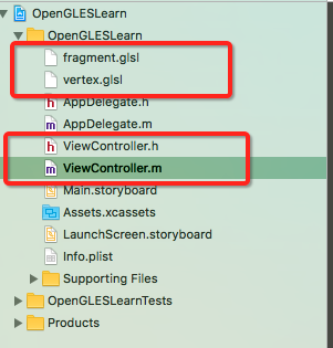 fragment.glsl和vertex.glsl是OpenGL ES2之后才有的Shader,用来对渲染流程中的两个重要环节进行编程,这个我们后面详细讲解。先看ViewController.h/m中的内容。