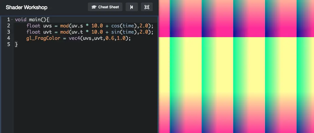 time是一个默认的uniform,会随着时间改变。uv是纹理坐标,有两个值s和t,值从0到1。有兴趣的可以去玩玩。