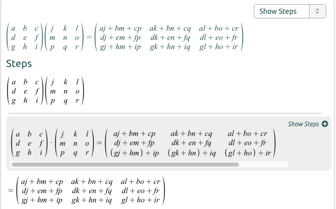 乘法稍微有些复杂,所以我用符号来代替数值,方便观察规律。我们看结果的第一行第一列aj + bm + cp,它就是左边的矩阵第一行和右边的矩阵第一列逐个相乘再相加的结果。