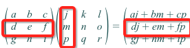 aj + bm + cp,它就是左边的矩阵第二行和右边的矩阵第一列逐个相乘再相加的结果。