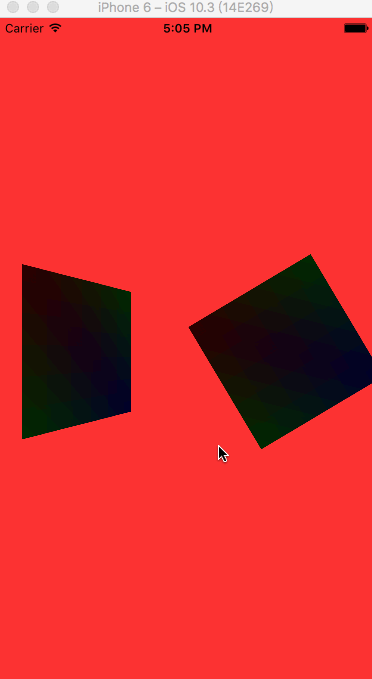 回到OC代码,我将之前的属性transform换成了4个变换矩阵,分别是两个M和VP。本文的例子将绘制两个矩形,所以我为它们分别定义了模型矩阵modelMatrix1和modelMatrix2。