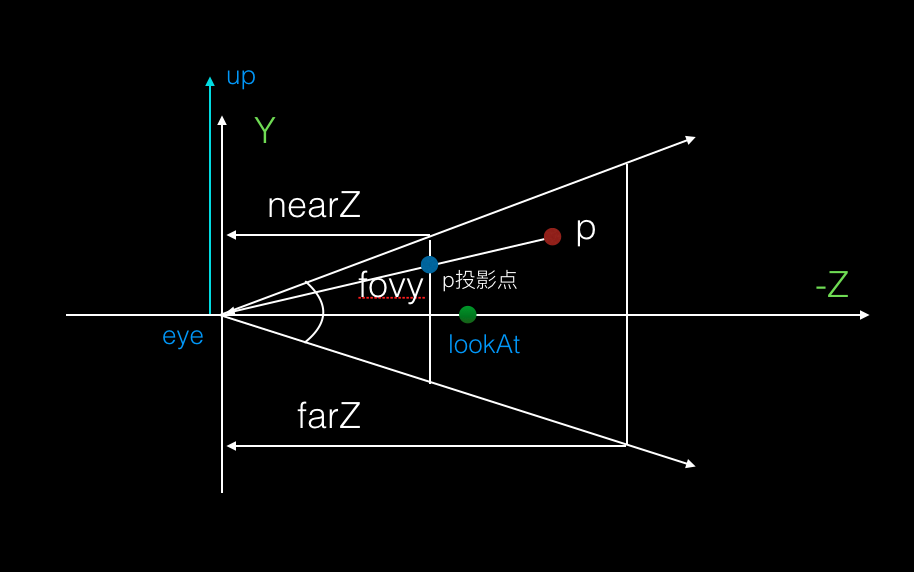 我们可以这么理解观察矩阵。在观察矩阵的作用下,透视矩阵的原点变成了摄像机的位置eye。up决定了摄像机围绕eye和lookAt形成的轴(本例中就是Z轴)的旋转角度,读者可以修改本例的中的up值看看效果。lookAt决定了摄像机能看到的区域,可以看做是控制摄像机在Y轴和X轴上的旋转角度。