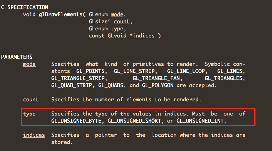 主要就是使用了glDrawElements绘制带索引的顶点数组。其中GL_UNSIGNED_SHORT指的是索引数组中每个元素的类型。这里索引数组用的是static GLushort cubeDataIndice[],所以使用GL_UNSIGNED_SHORT。除了这个值外,还能用的值为GL_UNSIGNED_BYTE,GL_UNSIGNED_INT。下面是glDrawElements的man文档。