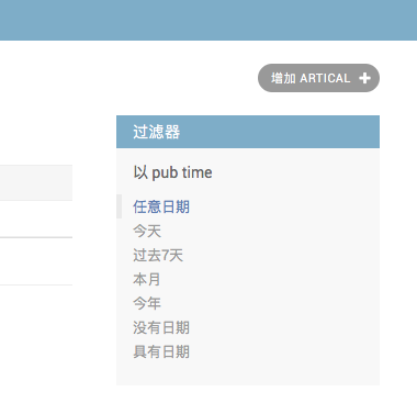 比如你在Artical的后台管理界面,只想看某一天的记录,那么我们在models.py中添加一个字段pub_time = models.DateField(null=True),然后在admin.py中的ArticalAdmin类中添加list_filter = ('pub_time',),最后要进行数据迁移python manage.py makemigrations和python manage.py migrate。效果如下: