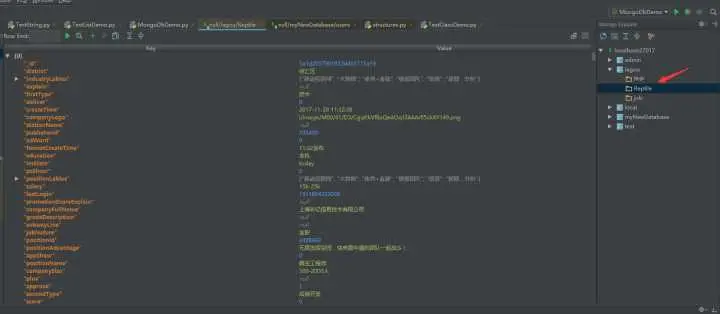 get_job_info(7,'爬虫')MongoDB保存数据成功后的结构如下图 所示: