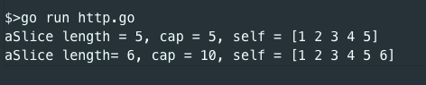 fmt.Printf("aSlice length = %d, cap = %d, self = %v\n", len(aSlice), cap(aSlice), aSlice)