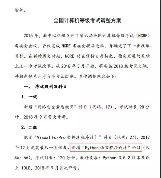 据媒体报道,教育部考试中心近日发布了“关于全国计算机等级(NCRE)体系调整”的通知,决定自2018年3月起,在计算机二级考试加入了“Python语言程序设计”科目。