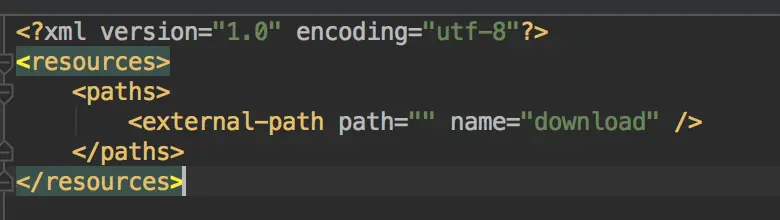 我们需要在资源(res)目录下创建一个xml目录,然后创建一个名为“file_paths”(名字可以随便起,只要和在manifest注册的provider所引用的resource保持一致即可)的资源文件,内容如下: