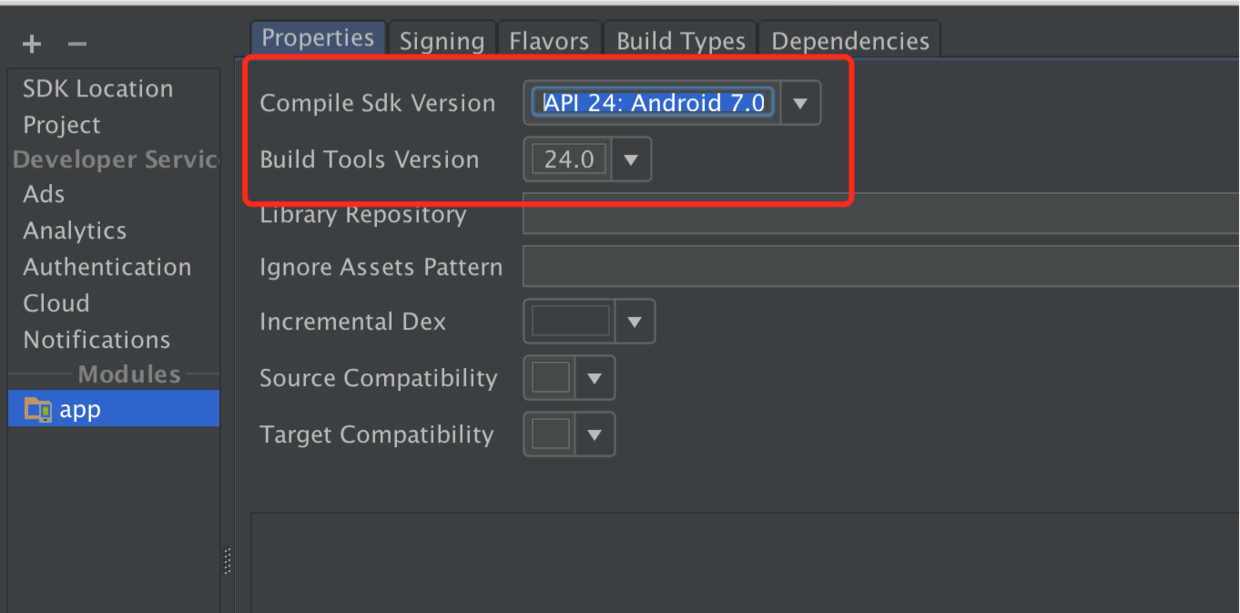 修改Compile SDK Version和Build Tools Version参数。(这个是单个module的配置,project中每个module都需要修改)
