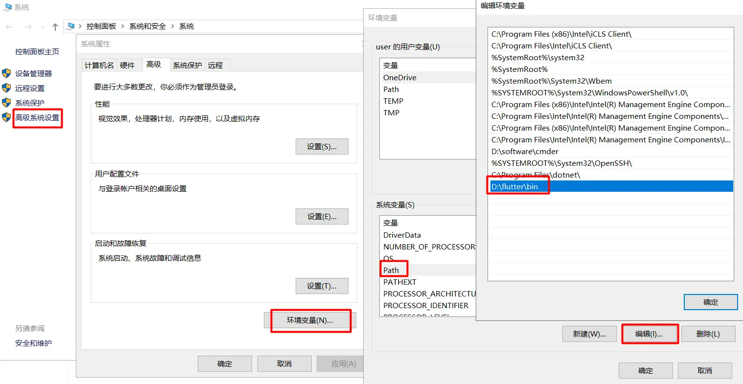 - 解压文件并将flutter的bin目录加入到环境变量中