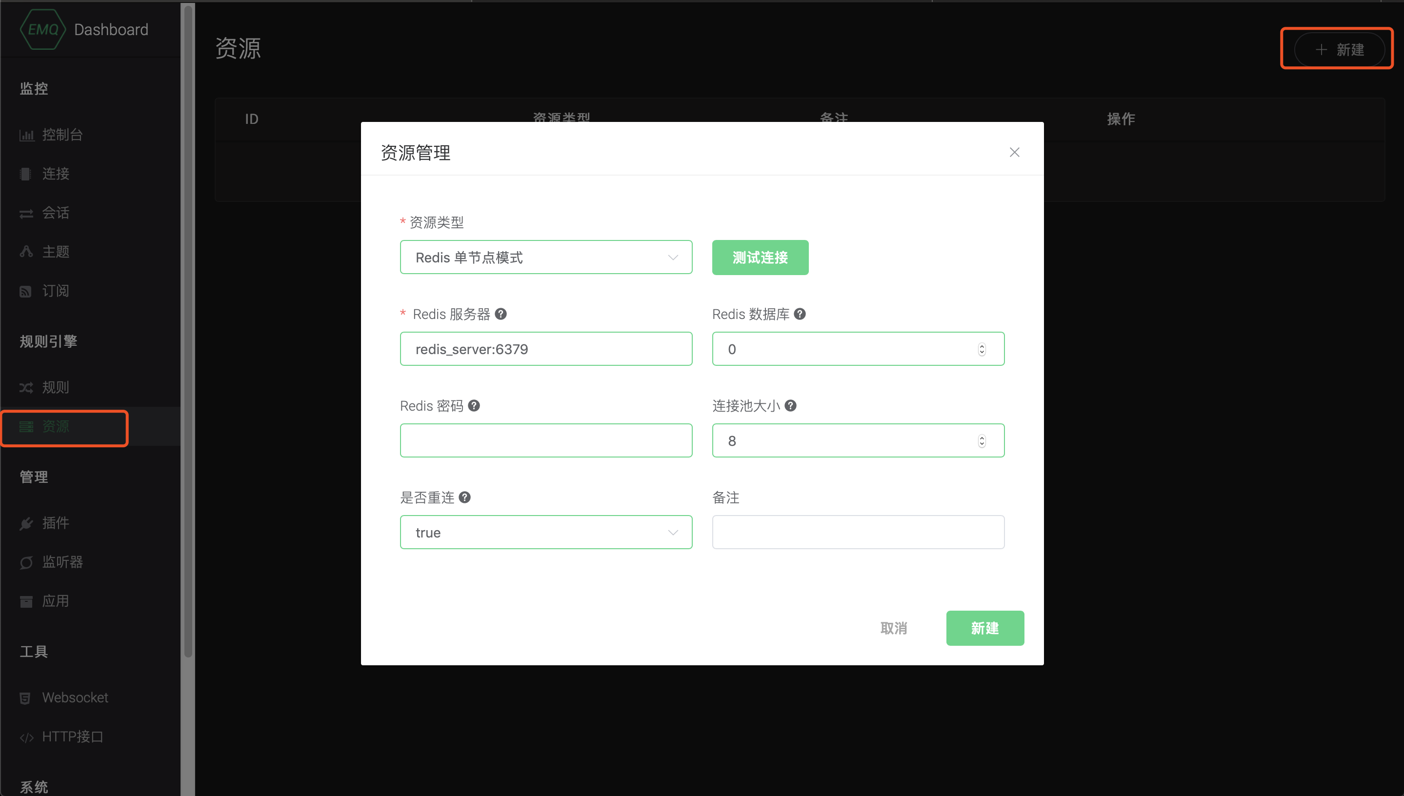 打开 EMQ X Dashboard,进入左侧菜单的 资源 页面,点击 新建 按钮,键入 Redis 服务器信息进行资源创建。