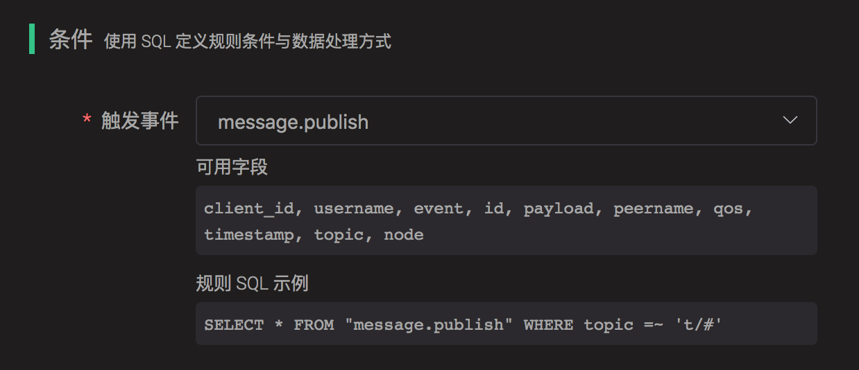 规则引擎使用 SQL 语句处理规则条件,该业务中我们需要将 payload 中所有字段单独选择出来,使用 payload.fieldName 格式进行选择,还需要消息上下文的 topic、qos、id 信息,当前 SQL 如下: