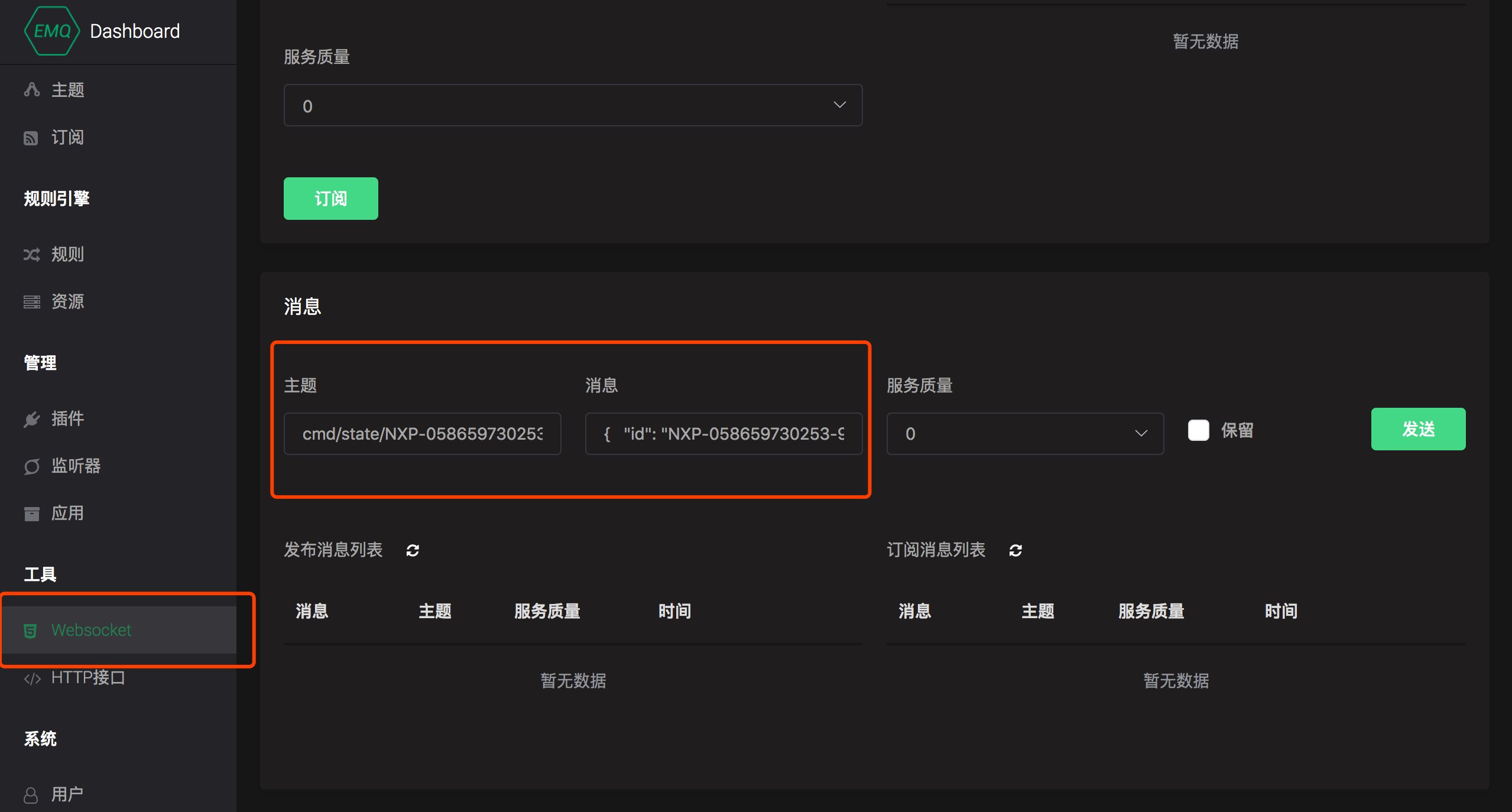 切换到 工具 --> Websocket 页面,使用任意信息客户端连接到 EMQ X,连接成功后在 消息 卡片发送如下信息: