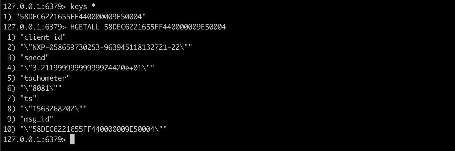 cmd/state/:id主题上报消息时,当消息中的tachometer数值超过 8000 时将命中 SQL,规则列表中 已命中 数字增加 1; - Redis 将增加一个以当前 message id 命名的哈希表,数值与当前消息一致。