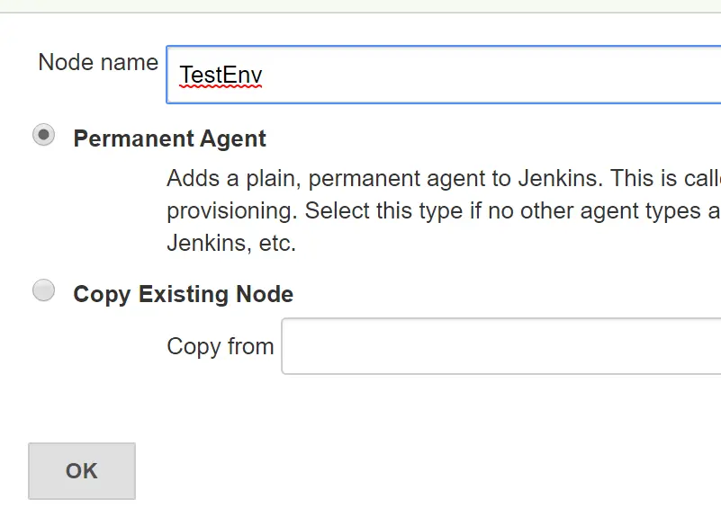 如果你的Jenkins安装到了Web服务器中,可以省略这个步骤,因为Jenkins默认创建了一个叫做master的节点代表Jenkins安装的机器,但是这样的话后面重启tomcat时,由于Jenkins运行在tomcat中,会随tomcat一起被关闭掉从而失去链接。相反,像我这样将Jenkins装到了本地机器,为了能够部署到远程的Web服务器中,你需要本步骤把Web服务器作为节点注册到Jenkins中。如下图,就是已经系统建好的了master,跟我创建的测试节点TestEnv。