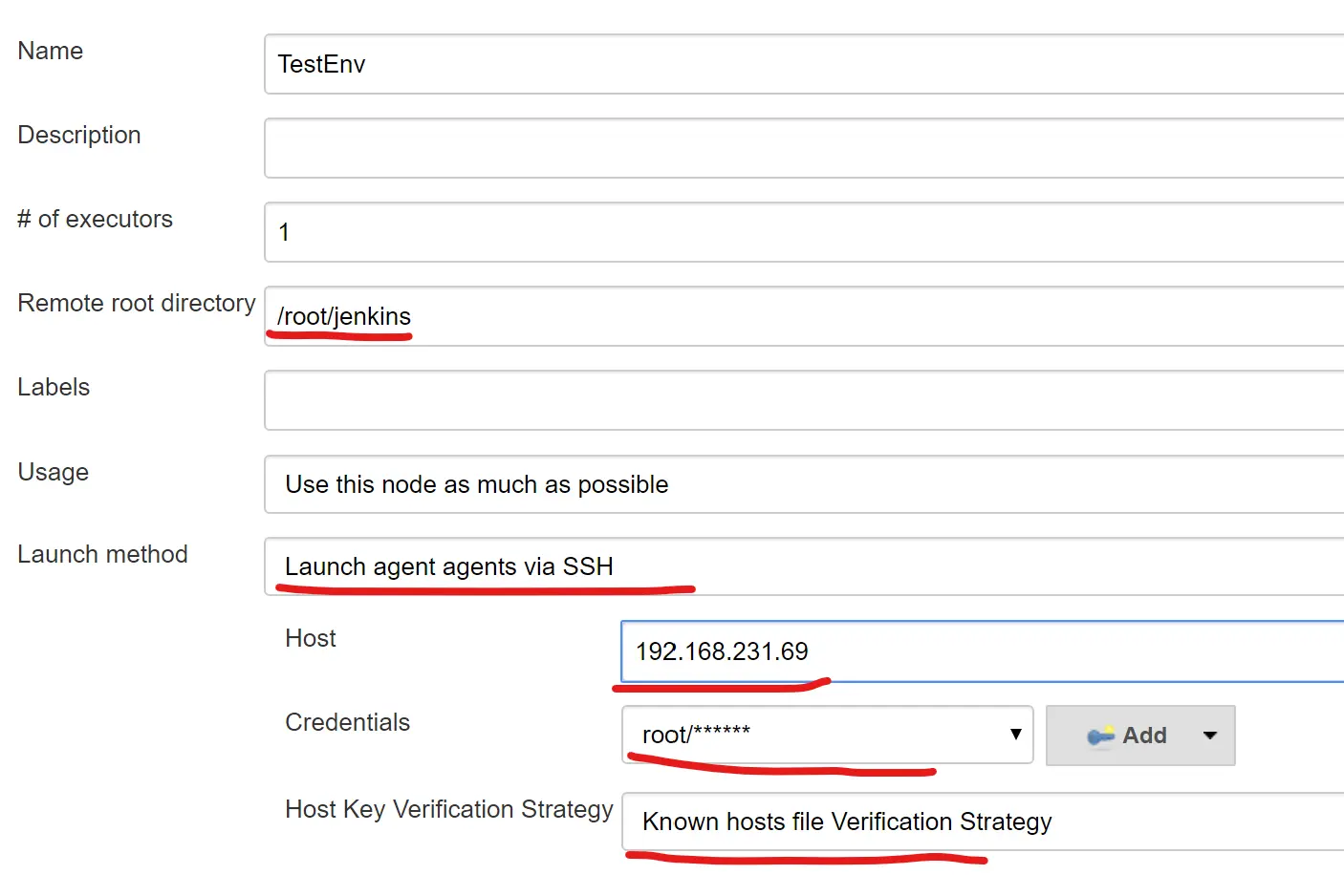 - Remote root directory 是你的在web服务器上的工作根目录。我这里用root登录,把工作目录放在/root/jenkins下。