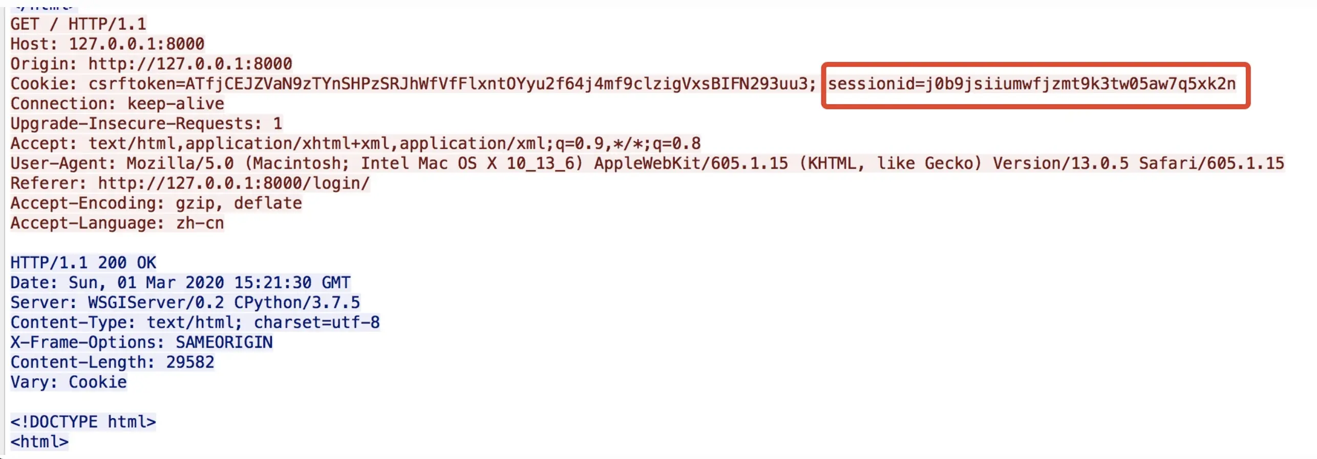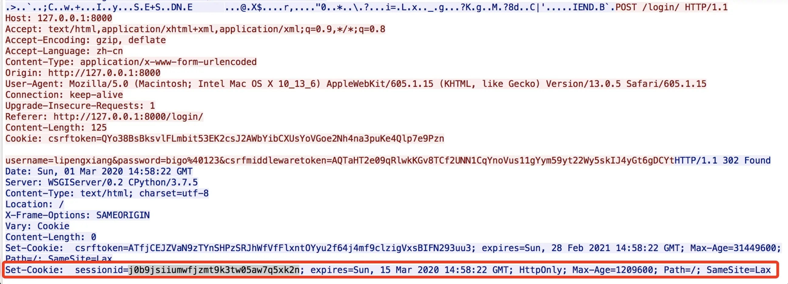 在发起登录请求后,服务端在response header中携带了Set-Cookie字段,内容包含了csrftoken,以及本次会话的sessionid。