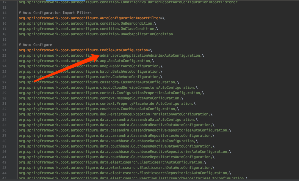 上图就是从SpringBoot的autoconfigure依赖包中的META-INF/spring.factories配置文件中摘录的一段内容,可以很好地说明问题。