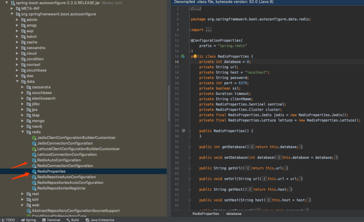 (2)@ConditionalOnClass(RedisOperations.class),当存在RedisOperations类时才会进行扫描,这个类什么时候被引入classpath的之后会提到。 (3)@EnableConfigurationProperties(RedisProperties.class)让RedisProperties 类被扫描到的关键。这时,如果RedisAutoConfiguration被扫描到,则同时也会去扫描RedisProperties类。 (4)@Import({ LettuceConnectionConfiguration.class, JedisConnectionConfiguration.class })通过@Import注解方式生成类实例并注入Spring容器。
