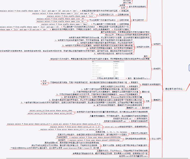 在一开始的时候,我也说了,常规的sql编写,其实在笔试中考察比较多,这个就是个人的一个技术能力的考察了,不是说能够取巧的,但是对于优化,更多的是理论的考察,那这些怎么办呢?关于mysql索引优化的相关知识图谱奉上