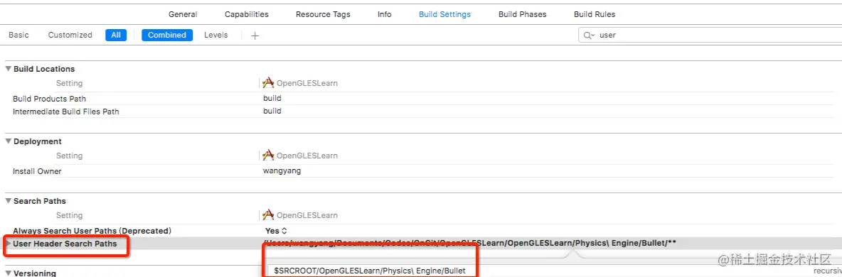 然后在Build Setting中添加用户头文件搜索路径。这是为了让Bullet的代码可以include到正确的文件。