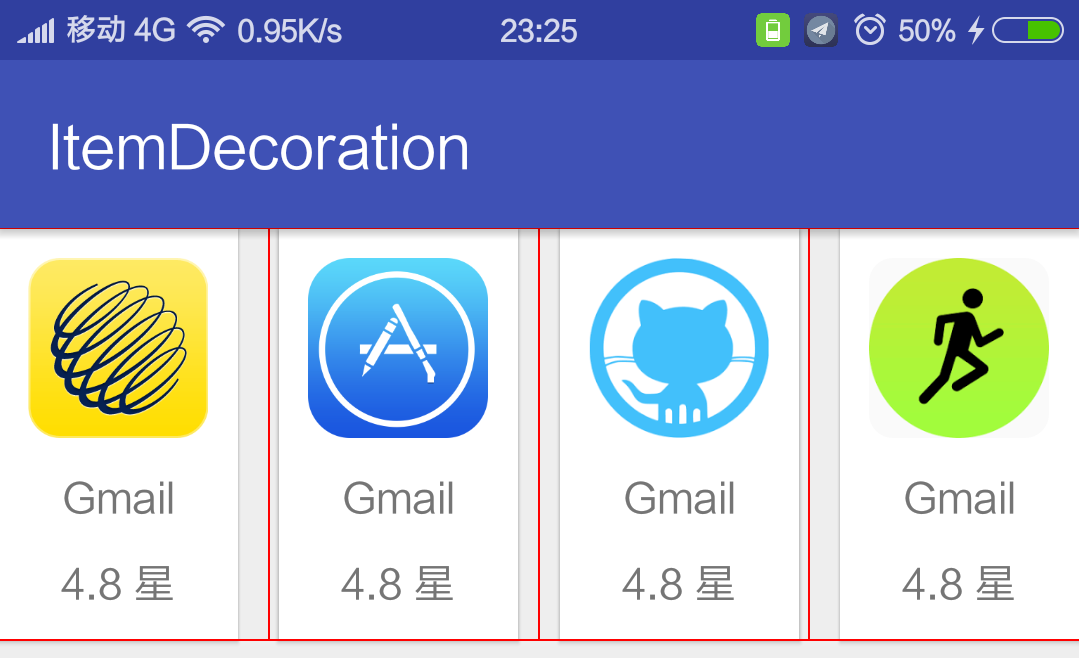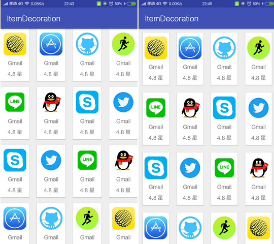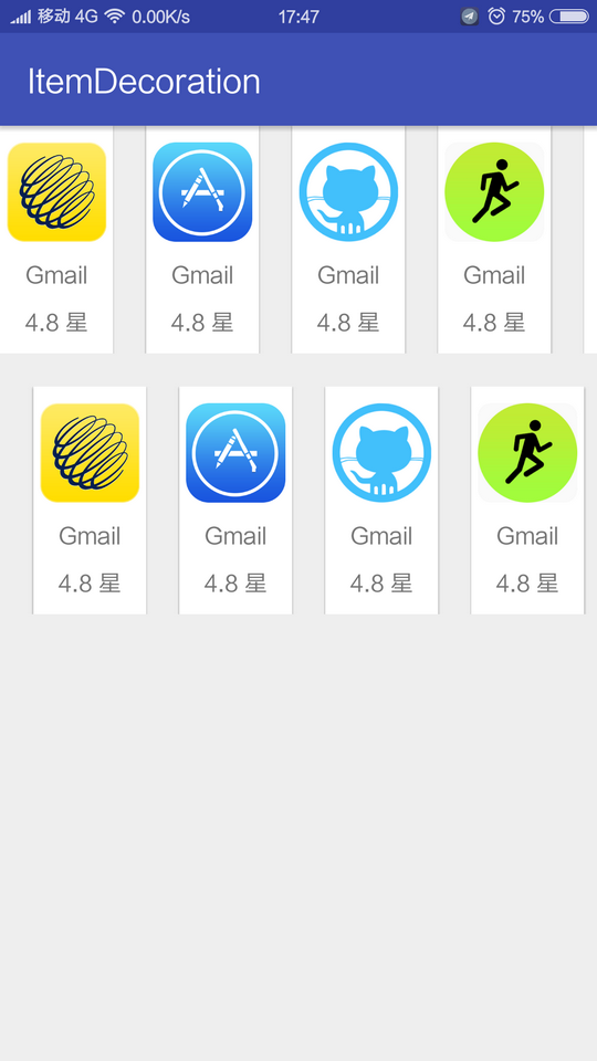 在没有ItemDecoration之前,我们一般都是在xml布局中调整Padding或者是Margin,然后在代码中根据position来控制,这样一来的话ViewHolder中会多出一些看上去很臃肿的代码。对于第二种情况我们也可以通过设置RecyclerView的paddingLeft以及paddingRight并设置clipToPadding为fasle来实现,但是滑动到边缘的时候,感觉会有点怪怪的。
