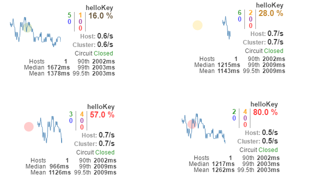 - 实心圆:共有两种含义。它通过颜色的变化代表了实例的健康程度,如下图所示,它的健康度从绿色、黄色、橙色、红色递减。该实心圆除了颜色的变化之外,它的大小也会根据实例的请求流量发生变化,流量越大该实心圆就越大。所以通过该实心圆的展示,我们就可以在大量的实例中快速的发现故障实例和高压力实例。