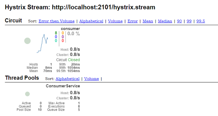 Delay:该参数用来控制服务器上轮询监控信息的延迟时间,默认为2000毫秒,我们可以通过配置该属性来降低客户端的网络和CPU消耗。Title:该参数对应了上图头部标题Hystrix Stream之后的内容,默认会使用具体监控实例的URL,我们可以通过配置该信息来展示更合适的标题。