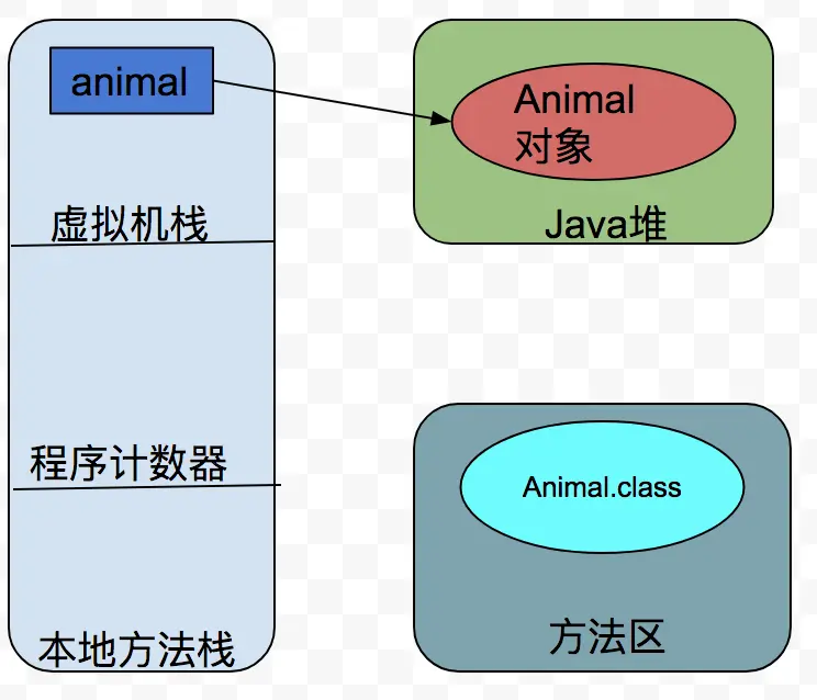 在main方法中,我们new Animal(),首先,检查内存中是否加载了Animal.class,如果没有加载,则会先将Animal.class加载到方法区中,同时在方法区开辟一块内存区域,用于存储static 的"the earth"(这里更能清晰的理解static这个关键字,就是static修饰的变量是属于类的,而不是属于类的某一个对象的),随后在Java堆中开辟一块内存区域,用于存储new Animal()这个对象,在虚拟机栈中的animal会指向这个对象的地址。