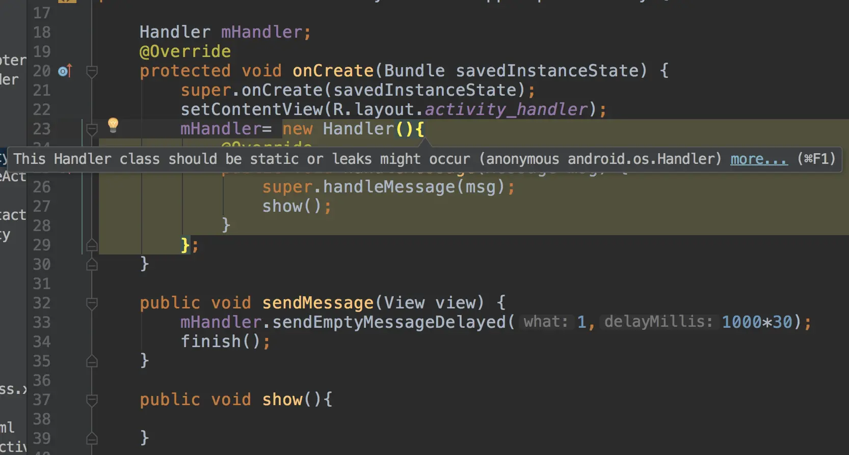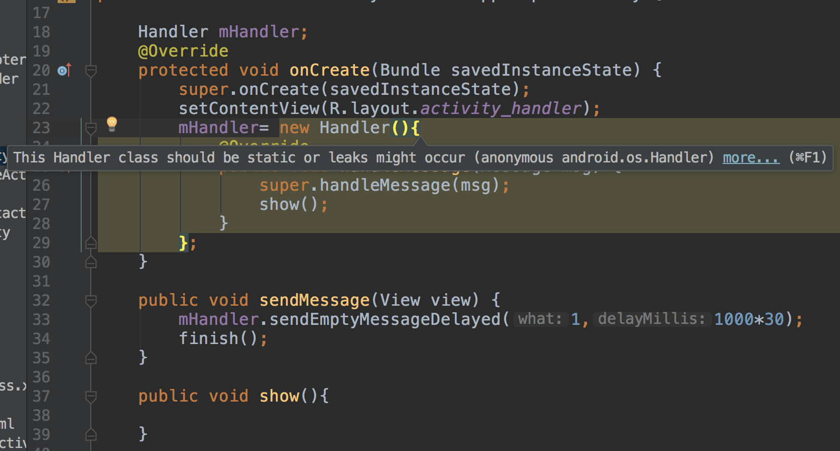 可以看到我们这么写Android studio已经提示了警告,提示我们应该用static修饰handler对象,否则会造成内存的泄漏,这是不容易犯的错误。
