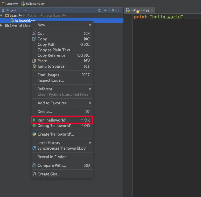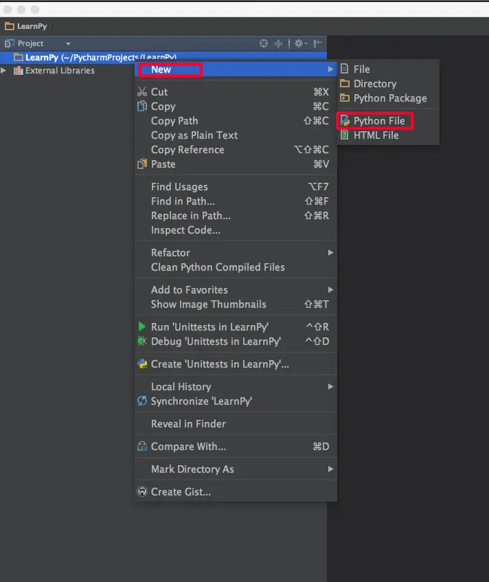 我们现在创建了一个LearnPy的工程,那么在这个工程下,我们要创建一个Python文件。