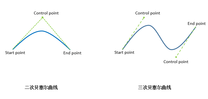Quartz 2D中曲线绘制分为两种:二次贝塞尔曲线和三次贝塞尔曲线。二次曲线只有一个控制点,而三次曲线有两个控制点,如下图所示