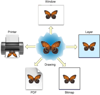 我们可以将Graphics Context想像成绘制目标,如下图所示。当用Quartz绘图时,所有设备相关的特性都包含在我们所使用的Graphics Context中。换句话说,我们可以简单地给Quartz绘图序列指定不同的Graphics Context,就可将相同的图像绘制到不同的设备上。我们不需要处理任何设备相关的计算;这些都由Quartz替我们完成。